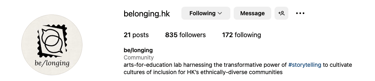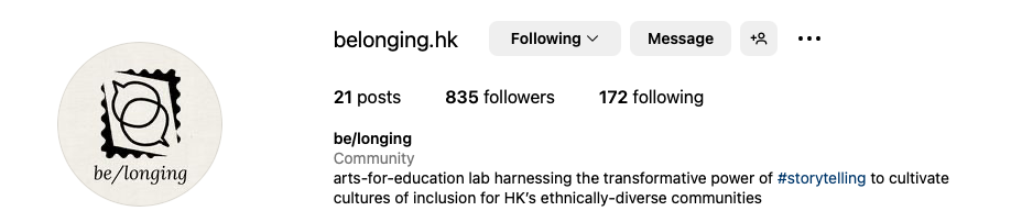 be/longing uses storytelling to explore experiences of being, longing, and belonging among Hong Kong's ethnically-diverse communities. Through arts education and other creative workshops and experiences, they offer marginialised voices a platform to be heard and build inclusive communities that they can comfortably and happily be a part of.