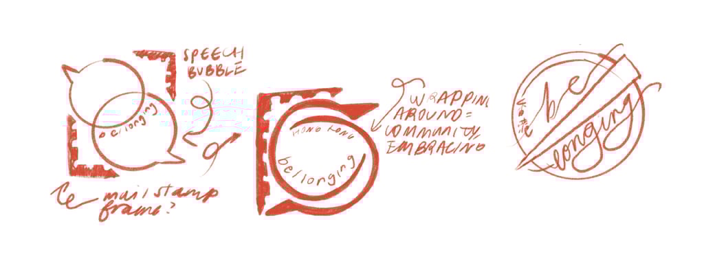 Two key concepts had to be captured in the logo: belonging and dialogue. Along these lines, early concepts for the logo explored the use of mail stamps to symbolise being from or belonging to a place. Speech bubbles were used to represent the conversations between communities and peoples that is at the heart of be/longing's mission.